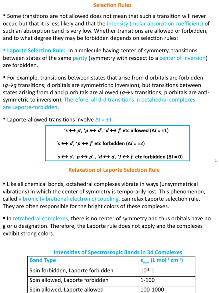Laporte Selection Rule : The Orbital Selection Rule / The laporte rule is a spectroscopic selection rule that only applies to centrosymmetric molecules (those with an inversion centre) and atoms.. Click on the first link on a line below to go directly to a page where laporte selection rule is defined. Electronic transition spin selection rule laporte selection rule coordination chemistry pg trb. Laporte rule — the laporte rule is a spectroscopic selection rule named after otto laporte. The rule that an electric dipole transition can occur only between states of opposite parity. The laporte rule is a selection rule formally stated as follows: